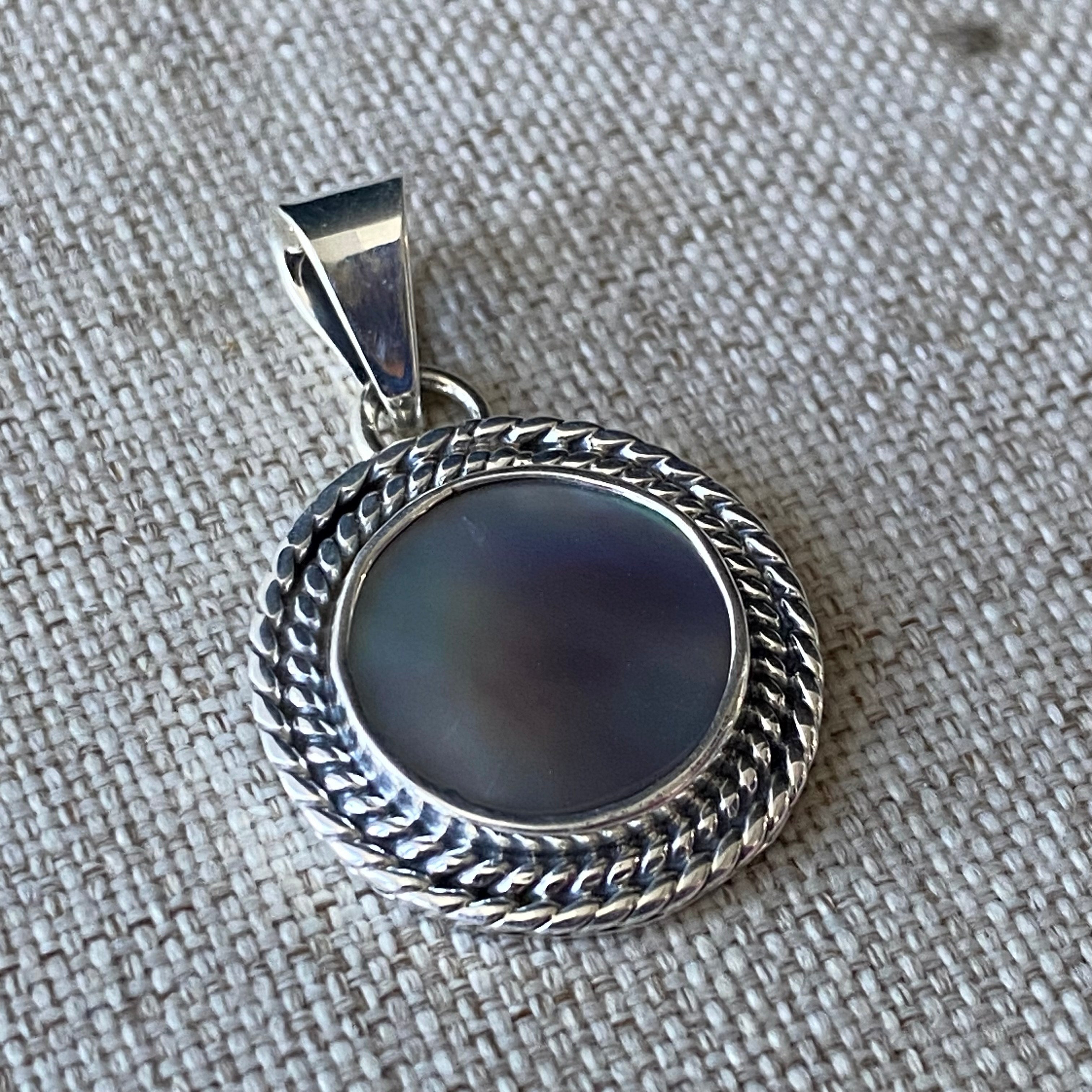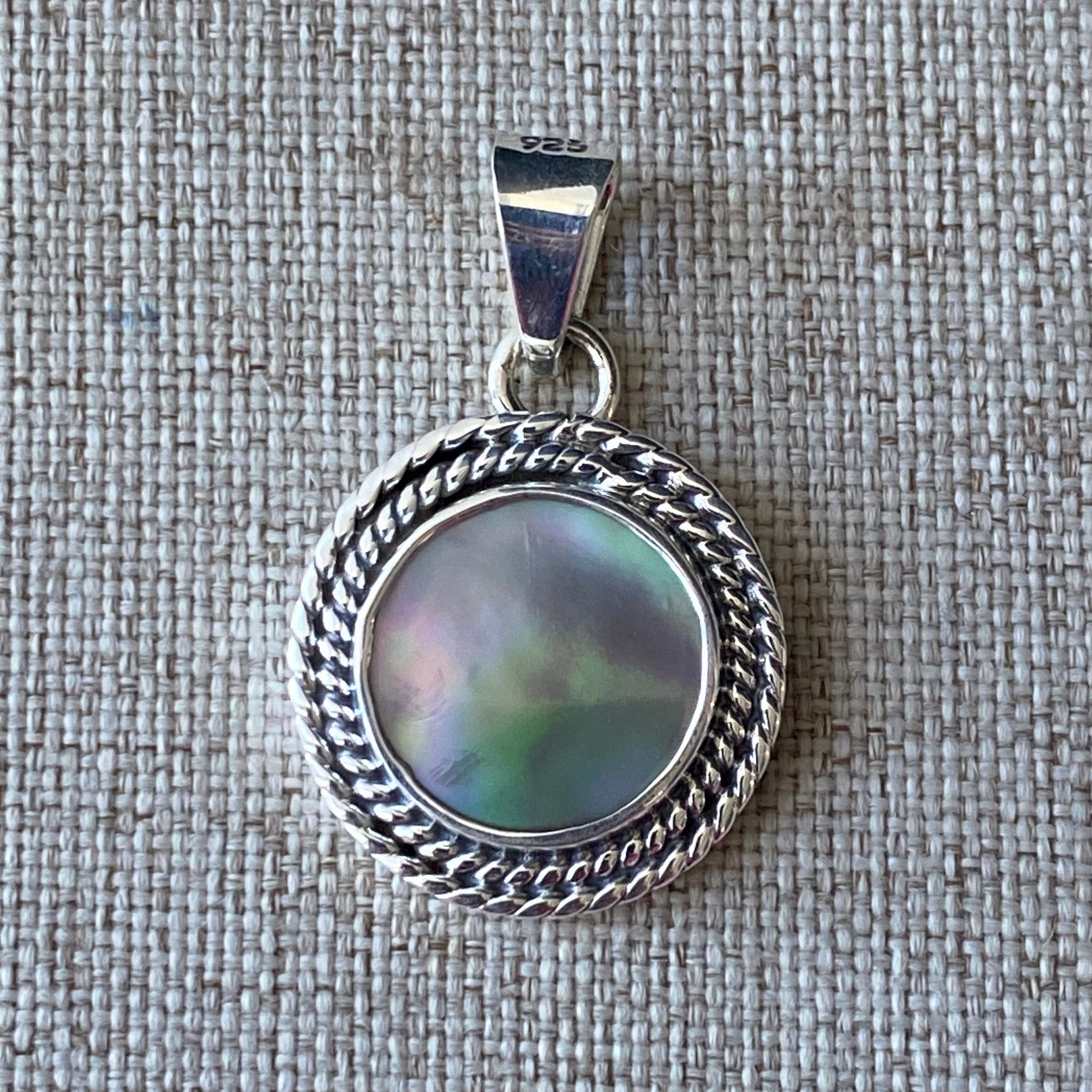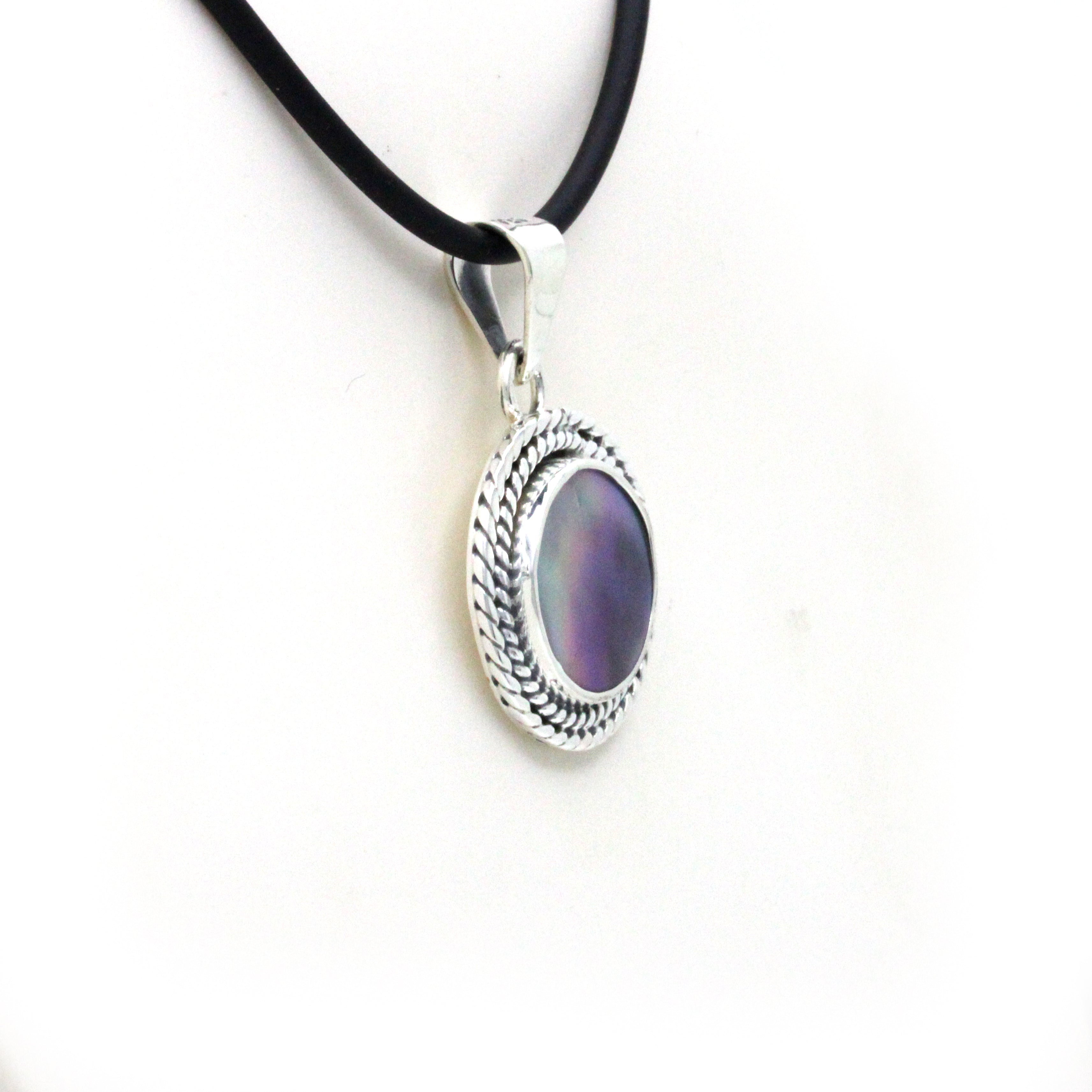 New and original pendant design with textures and lustrous finishes, crafted in 0.925 silver; its shape surrounds and enhances the piece of shell it holds, a round cut that displays beautiful and iridescent colors, hues that vary depending on how the light hits the surface.