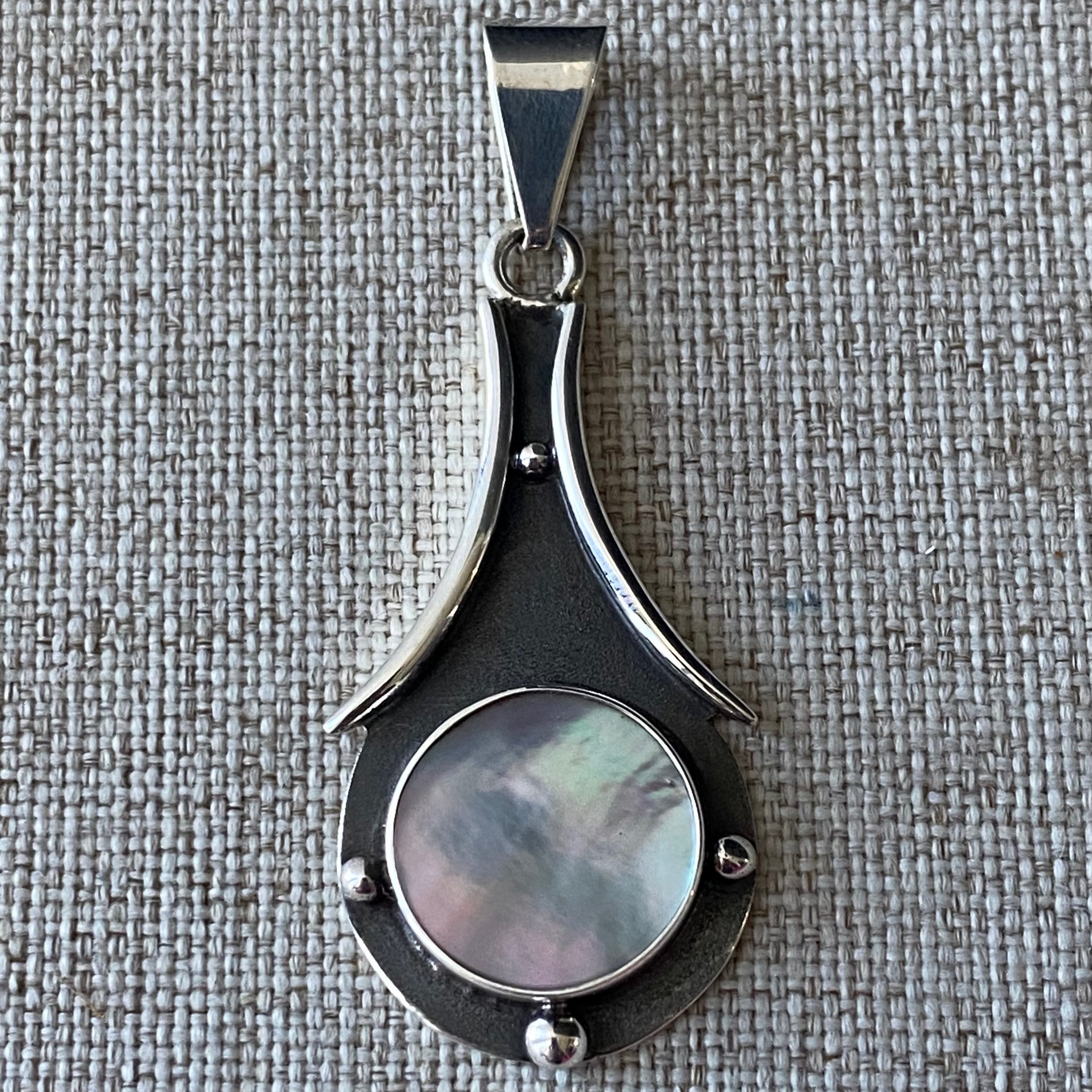 New and original pendant design with textures and dark finishes, crafted in 0.925 silver; its shape surrounds and enhances the piece of shell it holds, a round cut that displays beautiful and iridescent colors, hues that vary depending on how the light hits the surface.