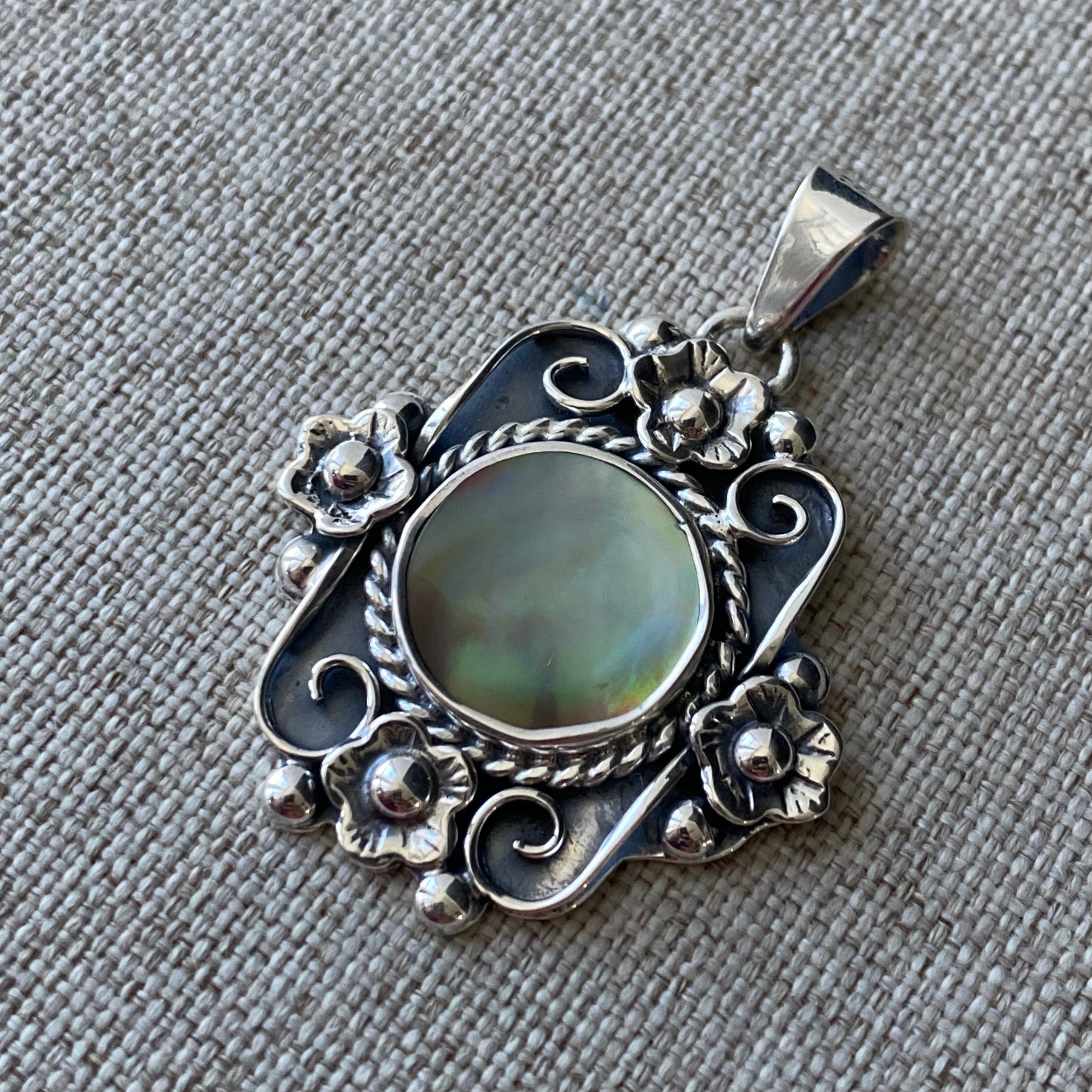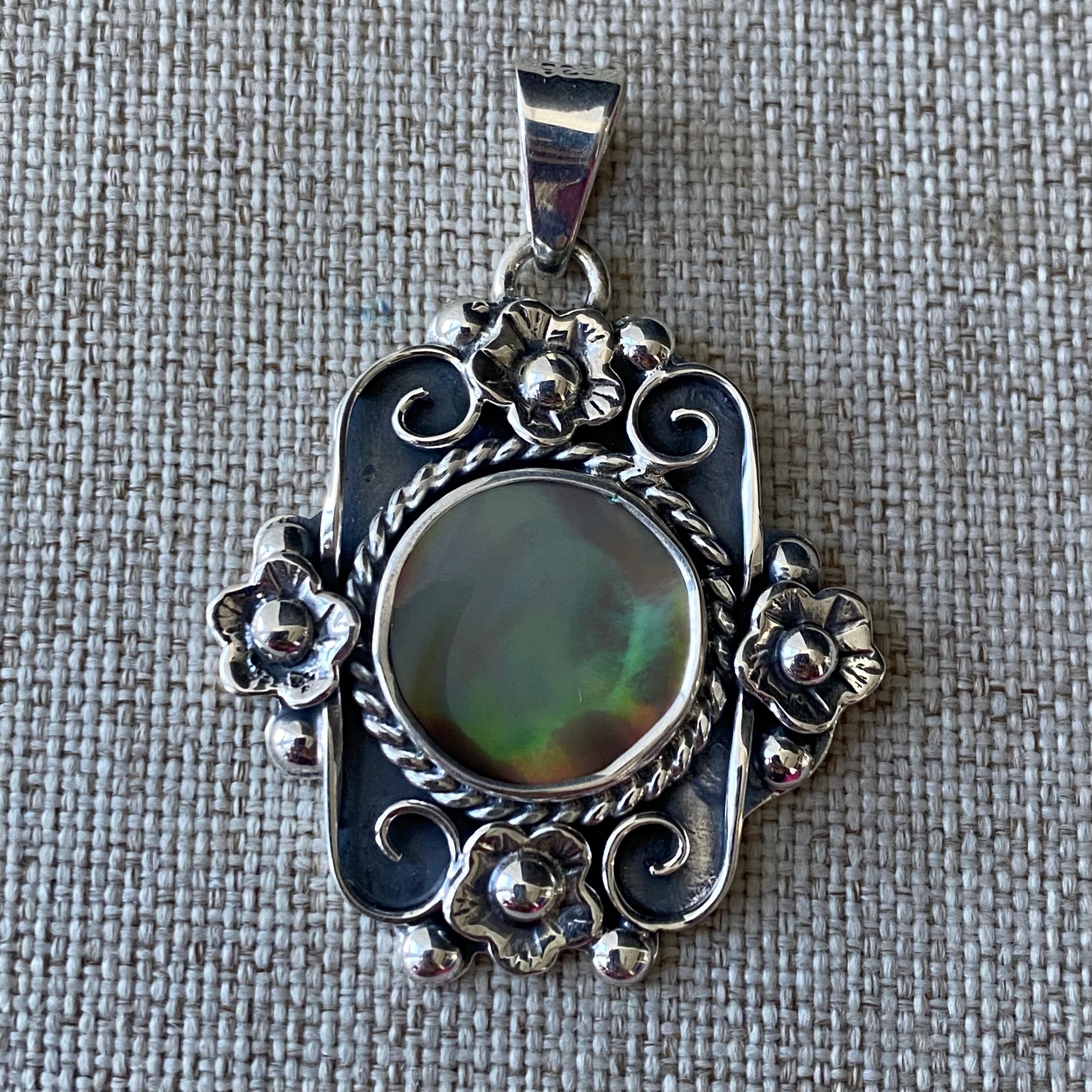 New and original pendant design with textures and dark finishes, crafted in 0.925 silver; its shape surrounds and enhances the piece of shell it holds, a round cut that displays beautiful and iridescent colors, hues that vary depending on how the light hits the surface.