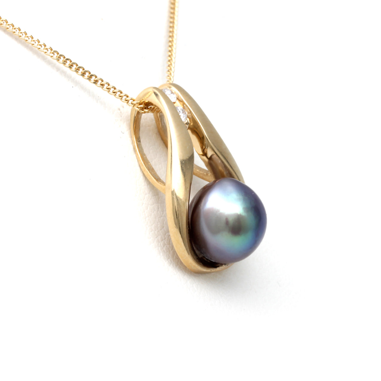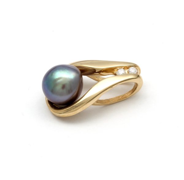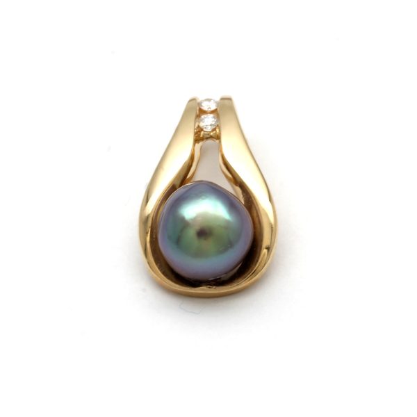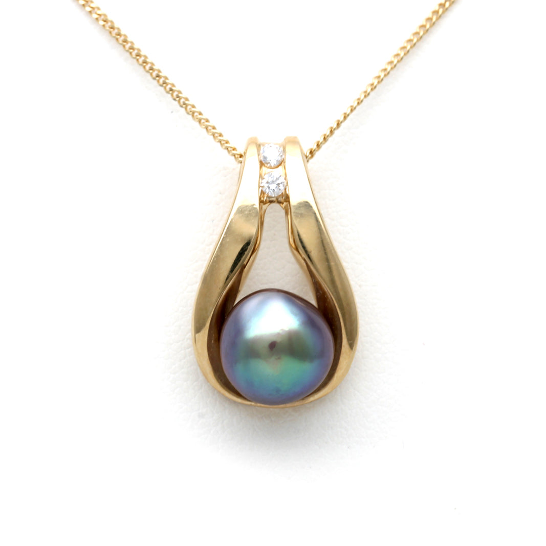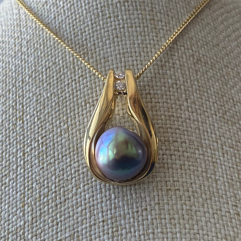 For this pearl, we selected a luxury design made by Kathe Mai of "TriGem Designs". She created this pendant in 18K yellow gold; its shape frames the unique beauty of the extraordinary pearl and is adorned with two Canadian Fair Trade diamonds. Without a doubt, a piece that will leave you breathless.