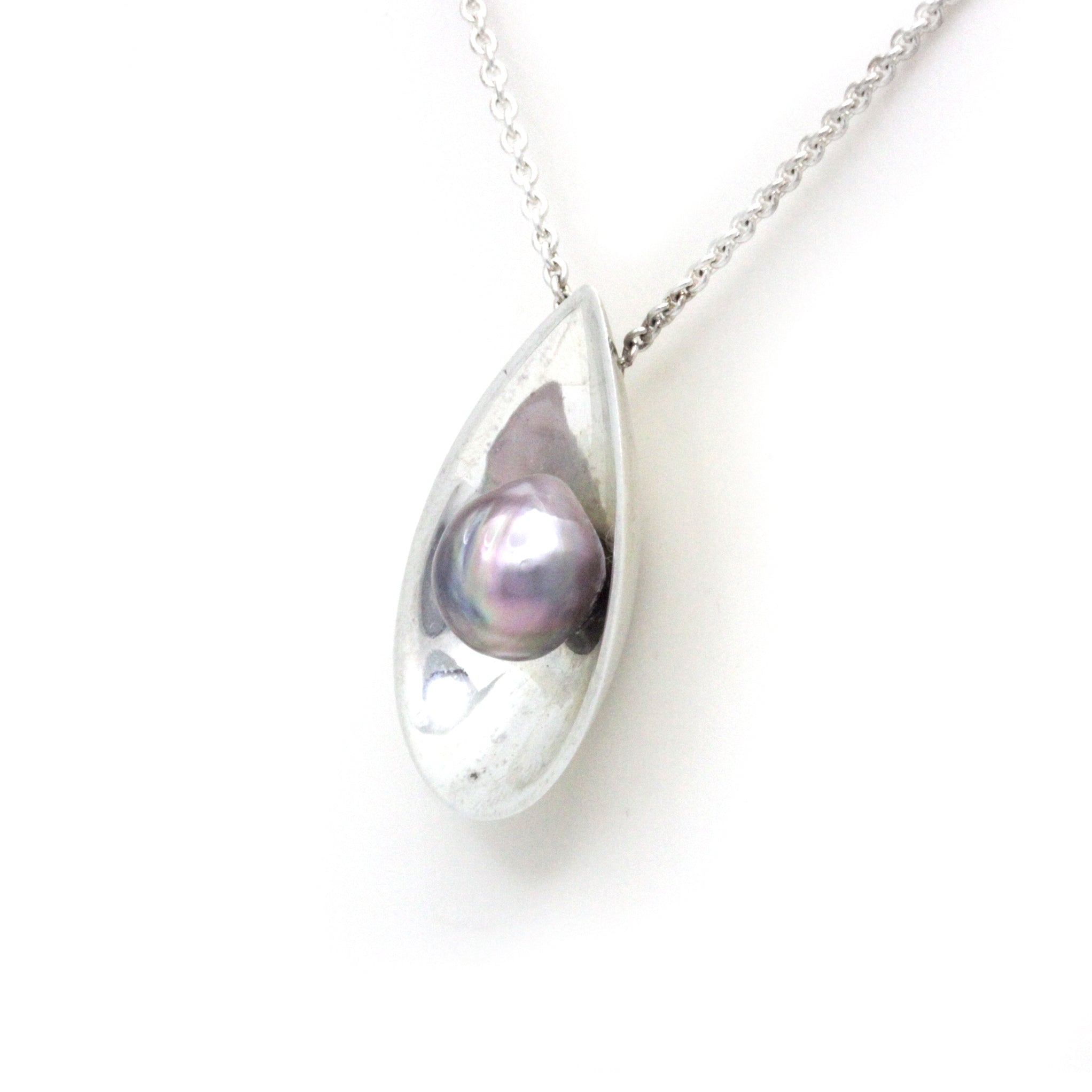 Un hermoso collar de estilo moderno y contemporáneo se añade a nuestro catálogo, y fue trabajado en plata 0.925 por la diseñadora mexicana "NS". Para darle vida a la pieza, se le colocó una Perla del Mar de Cortez única.