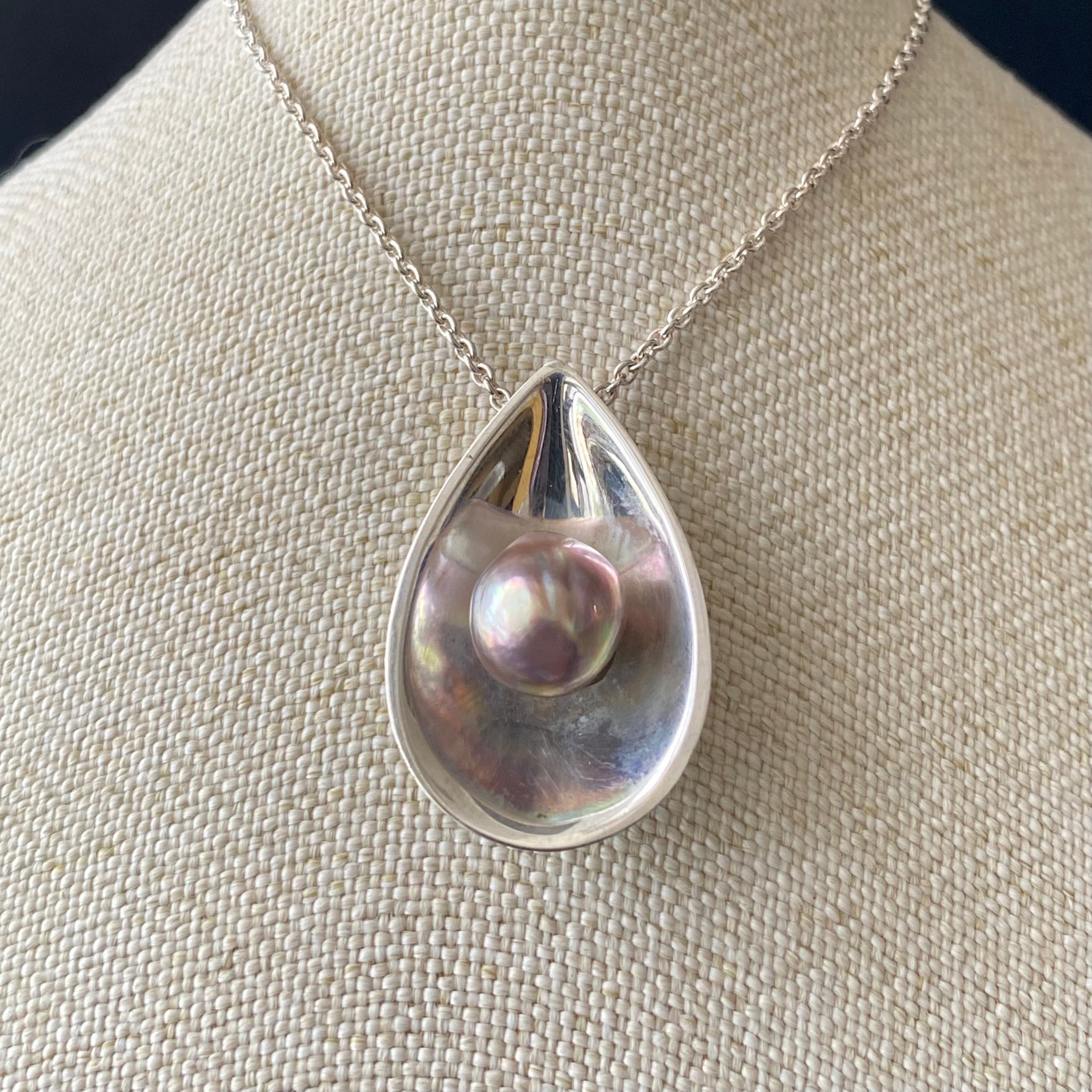 This is a new necklace designed by "NS" made by hand on sterling silver (0.925) with an stunning Cortez Pearl. This pearl has a very unique baroque shape, you'll see on the surface natural details made by the oyster, thanks to that you'll find iridescent colors on it. An amazing mix of colors reflected on the silver design, creating a mesmerizing visual delight, just a one of a kind. You'll love it for sure!